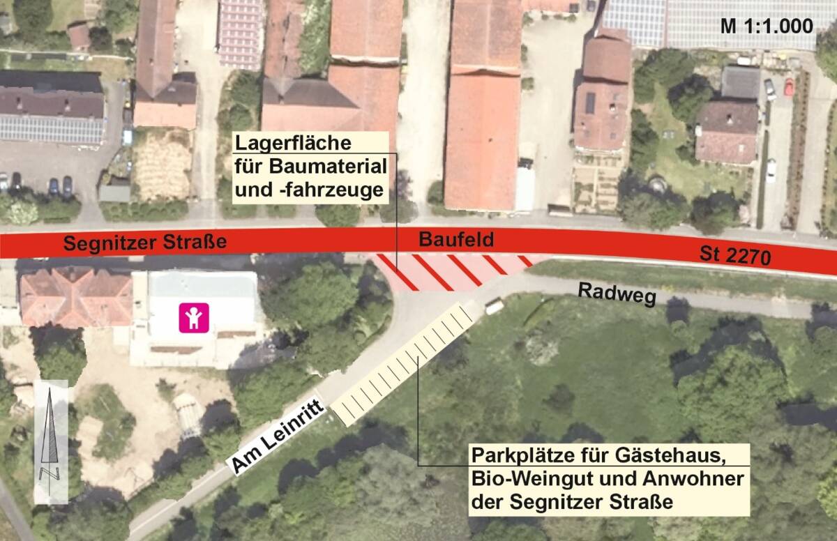 Ebenso stehen die aktuell vorhandenen Parkplätze entlang der Segnitzer Straße während der Maßnahme nicht zu Verfügung. Außerdem müssen die Parkplätze am Kinderhaus für Baufahrzeuge frei bleiben und stehen ebenfalls für diesen Zeitraum nicht zur Verfügung.